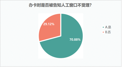 金融服务智能化发展趋势明显。问卷数据显示,在银行办卡时,有70.88%的消费者被告知人工窗口不受理,必须通过机器办理。体验调查中,16家银行人工窗口均不办理开卡业务,都只能通过智能机器操作。体验员在中国银行某支行的智能柜机开卡时,出现死机、自动闪退的问题。