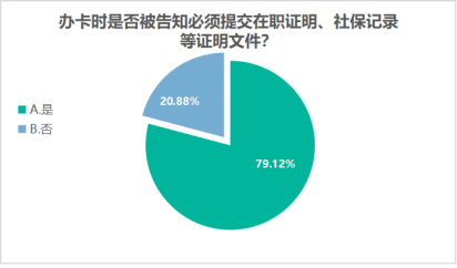 银行开卡加强信息审核的初衷是防范电信诈骗、洗钱等违法犯罪行为,但是在实践中,过度要求提供材料或扩大信息审核范围也给消费者正常开卡设置了障碍。问卷调查中,79.12%的消费者在办卡时被告知必须提交在职证明、社保记录等证明文件。体验员在体验过程中访谈一位正在中国银行某支行办卡消费者,其表示从外地刚来南京没有交社保,需要办卡才能入职,但是银行工作人员又要求提供入职证明或社保记录。在与银行持续沟通十分钟左右,银行工作人员才为消费者操作办卡。