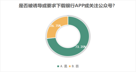 根据问卷调查,消费者被问及“是否被诱导或被要求下载银行APP或关注公众号”时,73.25%的消费者回答“是”,仅26.75%的消费者表示没有遇到过,诱导或强制要求消费者下载银行自身APP或关注公众号的现象普遍存在。