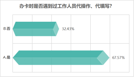 对于开卡过程中是否遭遇工作人员代操作、待填写问题,有67.57%的消费者选择“是”,仅32.43%的消费者表示未曾遇到过。体验调查中,兴业银行某支行在办理信用卡和借记卡过程中均出现工作人员代操作行为。
