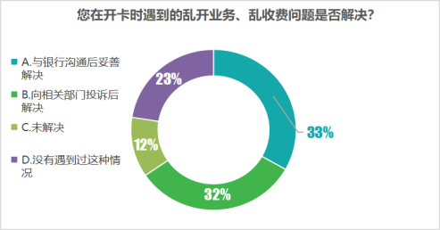 当被问及“您在开卡遭遇乱开业务、乱收费问题是否解决?”时,33%的消费者和银行沟通解决,32%的消费者向相关部门投诉后解决,还有12%的消费者表示未解决。银行作为服务机构,在银行网点明示办卡步骤及流程,做好产品与服务的信息披露,保障消费者的知情权和自主选择权,同时加强对银行网点的监督管理,及时清查违规收费等行为,保障消费者的财产安全。同时,还需要不断细化法律法规等规定,提高相关规定的可操作性和现实意义,从而更好地完善监管机制,积极解决消费投诉,化解消费纠纷,保障消费者合法权益。此外,倡导银行业协会等组织积极发挥作用,提高行业自律,更好地维护金融者的合法权益。