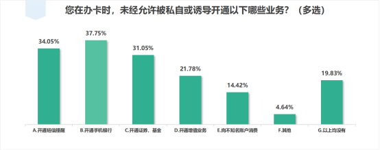 问卷调查发现,不到两成的消费者在银行开卡时,未曾遭遇过任何私自或诱导开通业务的行为。未经允许私自或诱导开通手机银行的消费者占比最多,为37.75%;34.05%的消费者表示未经允许被私自或诱导开通短信提醒;还有31.05%的消费者表示未经允许被私自或诱导开通证券、基金等账户;未经允许被私自或诱导开通增值业务、向不知名账户消费以激活卡片(例如消费1分钱送礼品)分别占比21.78%、14.42%。