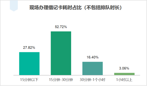 调查中,52.72%的消费者在银行办理借记卡时,花费时间(不包括排队时间)在15分钟-30分钟,16.40%在30分钟-1个小时,1小时以上的占比3.06%。仅27.82%的消费者花费时间15分钟以下。
