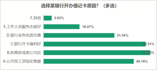 调查结果显示,在被问及“选择某家银行开办借记卡的原因(多选)”中,认为银行开卡福利好的消费者占45.51%,还有40.16%的消费者由于公司发工资指定需要,而选择“银行业务优质完善”、“工作人员服务态度好”分别占比31.54%、16.07%。47.5%的消费者选择“距离家或者公司近”,距离远近成为影响消费者选择某家银行开办借记卡的最重要因素。