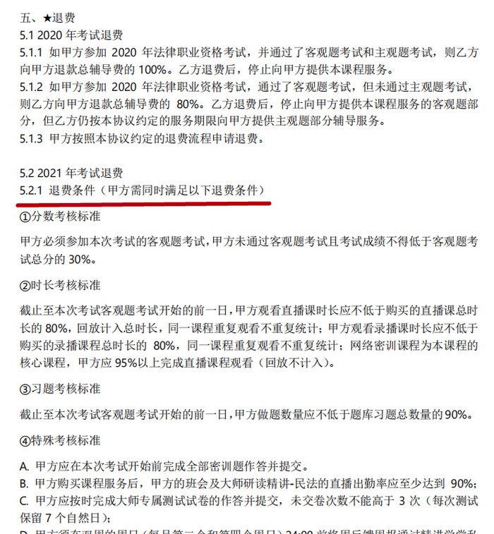 《中国消费者报》查看双方协议,发现其中确有2021年退费的相关约定,如“网络密训课程为本课程的核心课程,甲方应95%以上完成直播课程观看(回放不计入)”等,且退费比例为总辅导费用的80%。