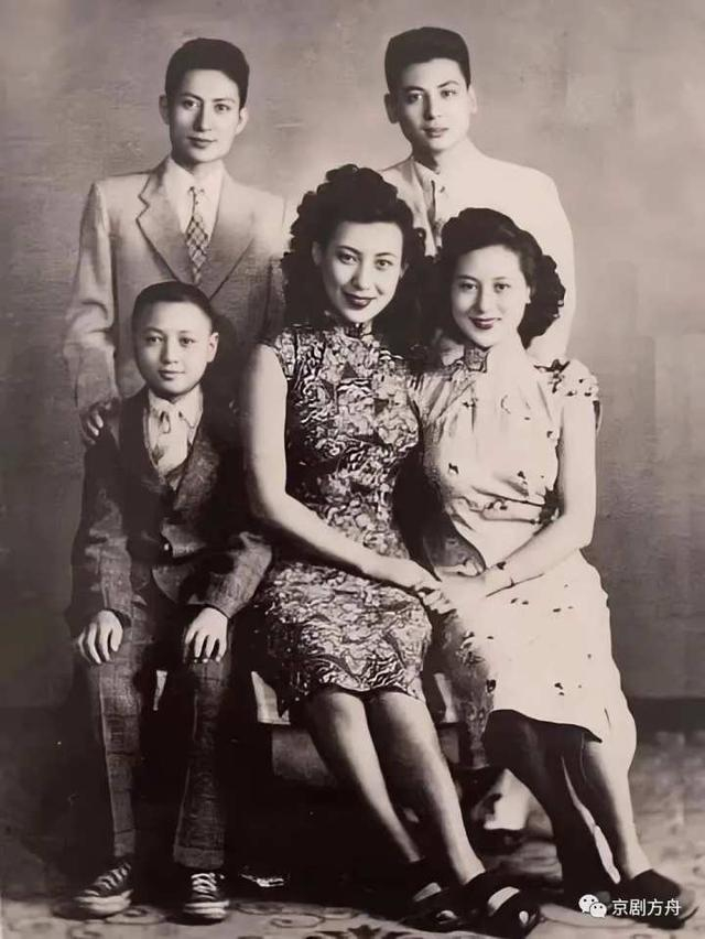 前排:父亲童汉侠(右)母亲陈倩颖(左)。后排左起:童祥苓、童侠苓、马彦祥(童葆苓丈夫)、童寿苓。中排左起:张南云(童祥苓妻子)、童芷苓、李多芬(童侠苓妻子)、童葆苓