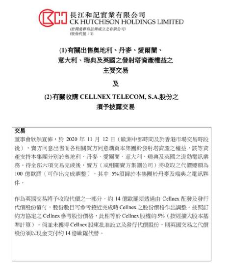2020年11月,为提升业绩表现,长和宣布以100亿欧元(约合人民币696亿元)出售其在欧洲市场的电信基础设施业务,包括英国、丹麦、爱尔兰等六国的2.5万个电讯发射塔资产和业务权益,买方为欧洲最大无线基站运营商、西班牙无线通信基础设施运营商Cellnex Telecom。