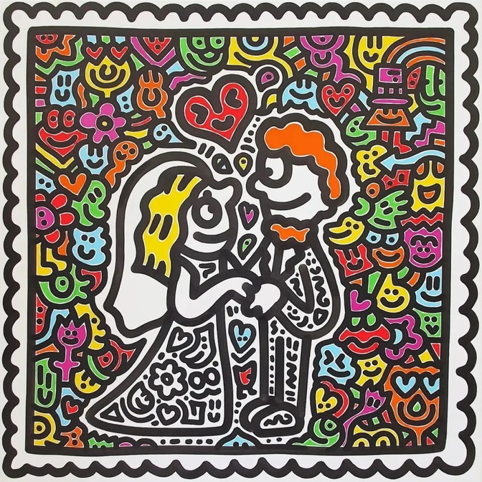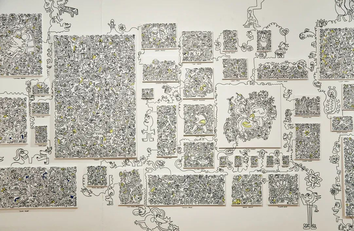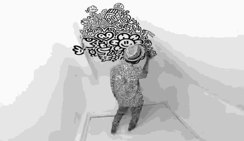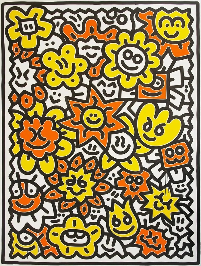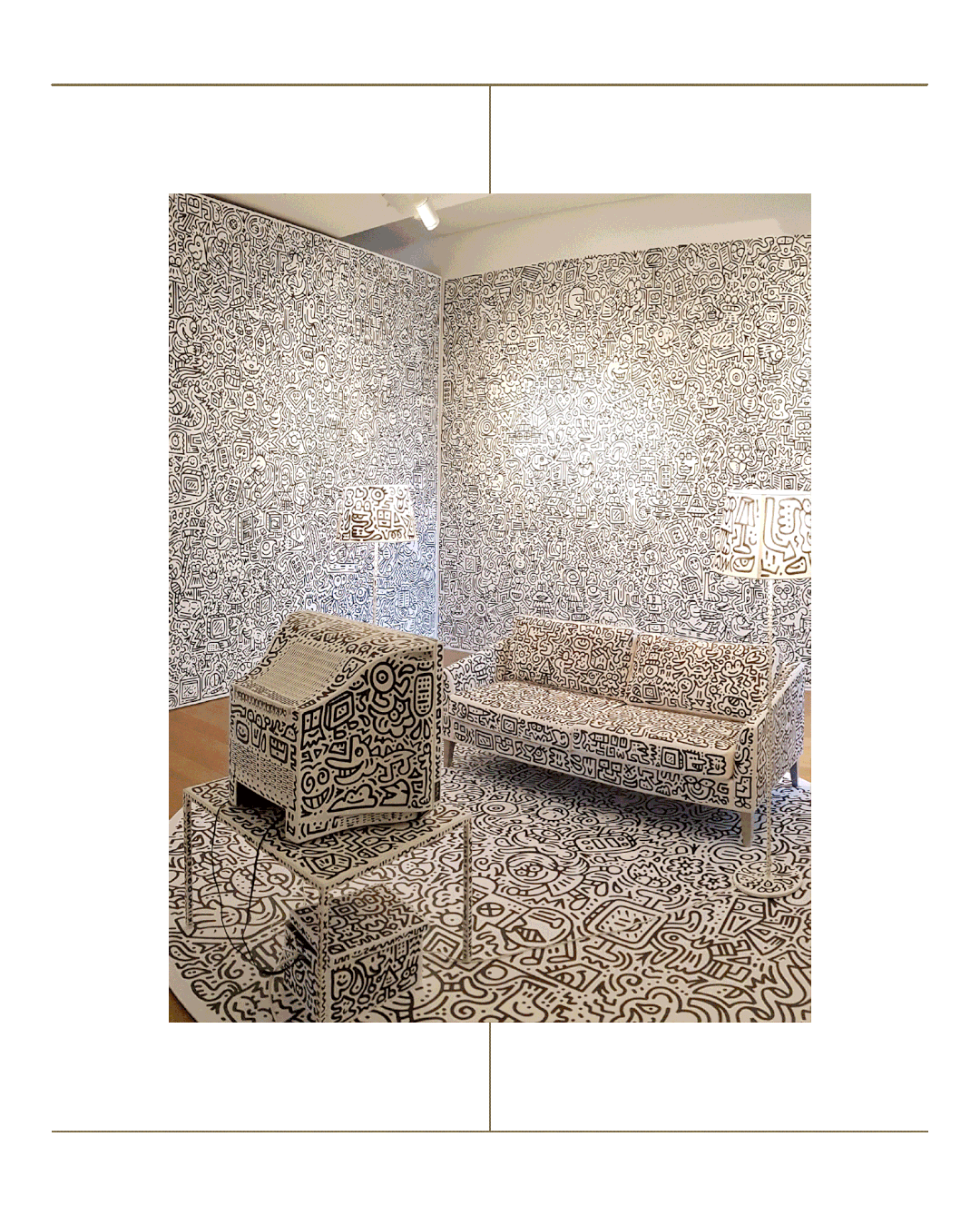 涂鸦先生构建了一个崭新的视觉体系,那就是他的 doodle world。他的作品不仅存在于画布中,也延展至家具、地铁、书籍、服装等。有人形容他的作品是一种「涂鸦意面」,在这个涂鸦世界里,那些卡通人物、物件和图案无限繁衍,极其密集地蔓延着。