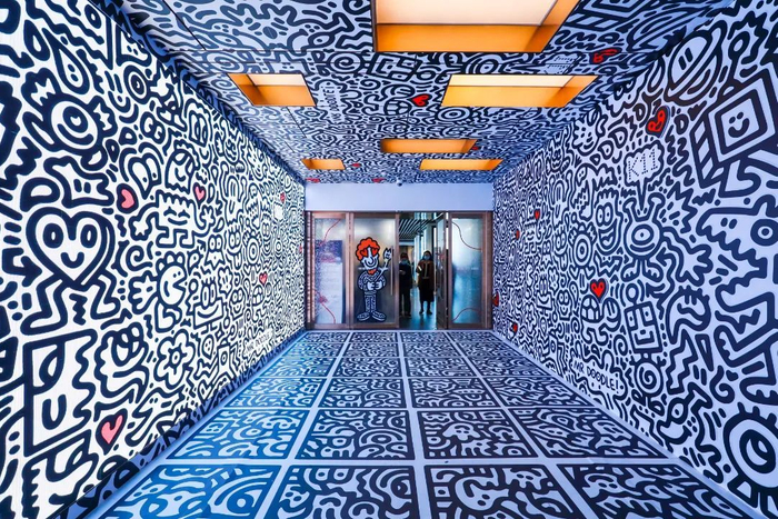 ● 由mr doodle涂鸦元素包裹的上海k11 b2地铁入口处