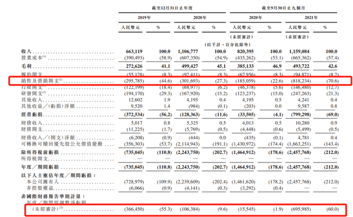 但与此同时,值得注意的是,2019年、2020年和2021年前三季度,Keep的销售及营销开支分别为2.95亿元、3.01亿元和8.18亿元,其中,2020年同比仅增长2%,2021年前三季度却已较2020年整年增长172%。