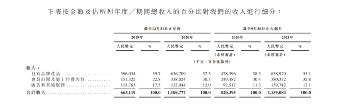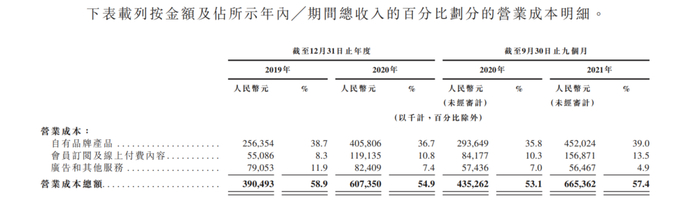 虎嗅据此大致推算出2021年前三季度,自有品牌产品业务的毛利率为29%,会员订阅及线上付费内容毛利率为58%、广告和其他服务毛利率为59%。