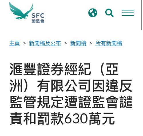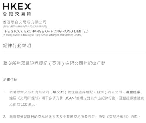 3月3日,香港证监会(“证监会”)和港交所分别对汇丰银行旗下汇丰证券经纪(亚洲)有限公司(“汇丰证券”)做出谴责,指其过去几年在代客交易沪深港通下合资格A股时存在多项错误,且违反《交易所规则》和《证券及期货事务监察委员会持牌人或注册人操守准则》,并分别开出630万港元和100万港元的罚单。