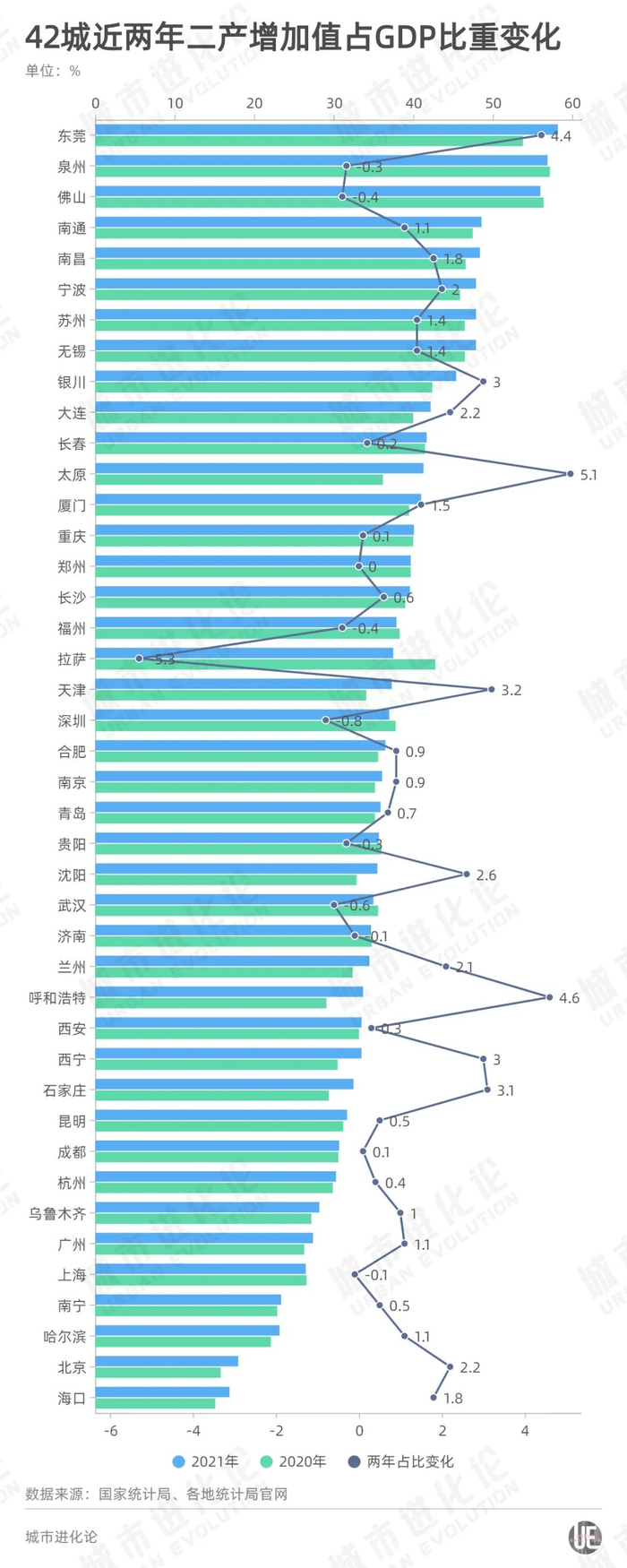 此外,呼和浩特、东莞、天津等城市去年第二产业增加值比重上升幅度较大。其中,去年新晋“万亿俱乐部”的东莞,第二产业增加值比重从2020年53.8%提高到58.2%,比重超过泉州、佛山,居全国首位。