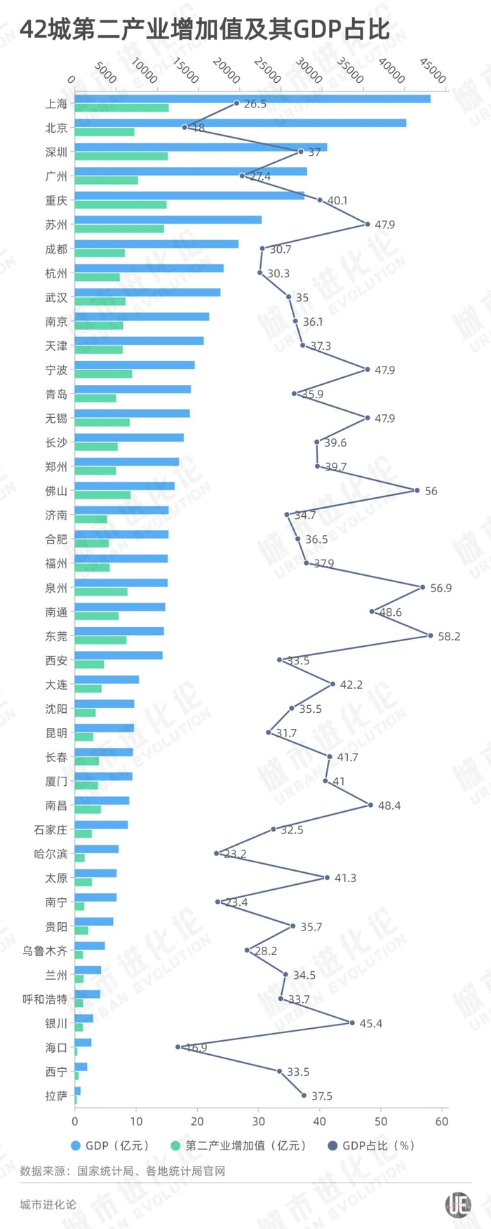 结合各地经济年报数据,去年全国42个重点城市GDP总量为52.62万亿元,占全国GDP总量的46%;42城第二产业增加值为19.03万亿元,占全国第二产业增加值比重为42.2%。