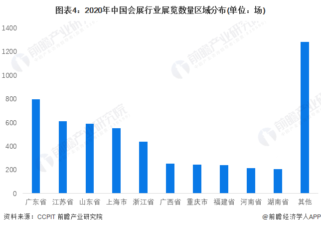 从区域分布角度来看,2020年,全国按展览面积排名的前十个省(直辖市)为:广东省、江苏省、山东省、上海市、浙江省、广西省、重庆市、福建省、河南省和湖南省。以上十个省(直辖市)的展览数量占全国展览总数的76.29%,展览总面积占全国展览总面积的72.95%。
