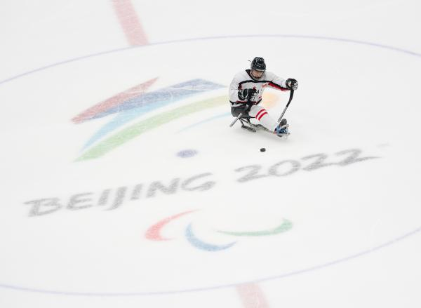 2022年3月3日,一名中国残奥冰球队在北京国家体育馆进行赛前训练。 新华社发
