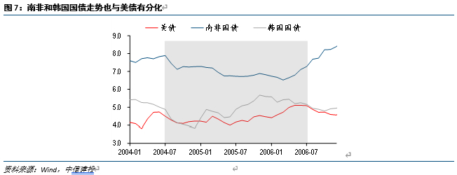 南非和韩国在逆势降息阶段,国债表现并不差。另一个大家更为关心的话题,则是债市如何表现。以南非和韩国为例,二者均在美国加息的前半段进行逆势操作。这一阶段,首先美债整体较为平稳,加息落地后大幅上冲不明显。其次,韩国和南非国债收益率均明显下行,幅度均在100个bp以上。因此,国债的走势这个阶段仍整体由国内货币政策决定。