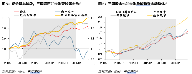 2004年美国加息周期中,新兴市场货币和股市未出现趋势性下行趋势,而是整体向上,甚至大规模的调整都没有看到。初期选择逆势降息的韩国和南非,货币走势不输新兴市场整体,倒是后期降息时南非兰特反而大幅走低。后期降息的巴西雷亚尔也出现了止跌修复的行情,在其之前的加息过程中,汇率走势反而很差。股市也有类似的情况出现,整个加息周期中,三国股市整体均跑赢新兴市场整体。