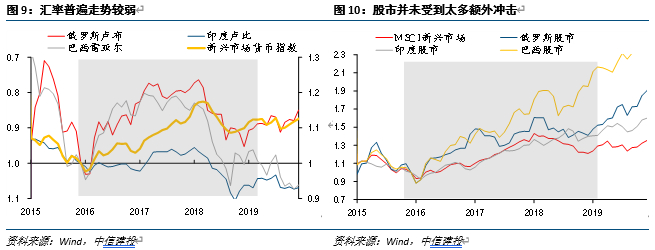 (2)美国加息周期中,新兴市场货币整体并不算差,但逆势降息的国家货币走势相对较弱,甚至有贬值压力。选择逆势降息的一个主要成本或风险,可能来自汇率的压力。