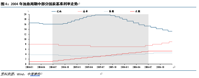 本轮美国加息的早期,南非和韩国均选择了两次小幅降息进行试探,但持续时间并不长。南非在2004年-2005年,基准利率从8%降至7%。韩国由于经济走势低迷,消费不振,大宗商品价格上涨带来GDP增长压力,而CPI保持温和,同样在2004-2005年降息50个bp至3.25%。2006年两国相继结束降息操作,转而开始加息。巴西情况恰好相反,2004年巴西顺应美国加息周期,连续调高基准利率。2005年底,为缓解政府债务压力,应对经济持续下行,巴西开始连续降息,基准利率从20%降至15%。