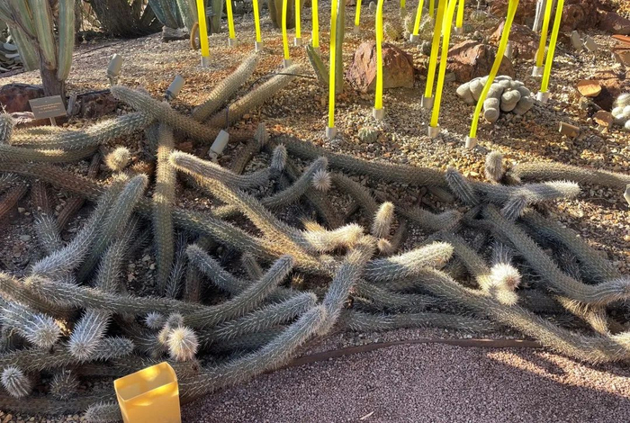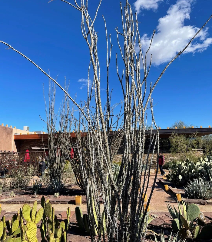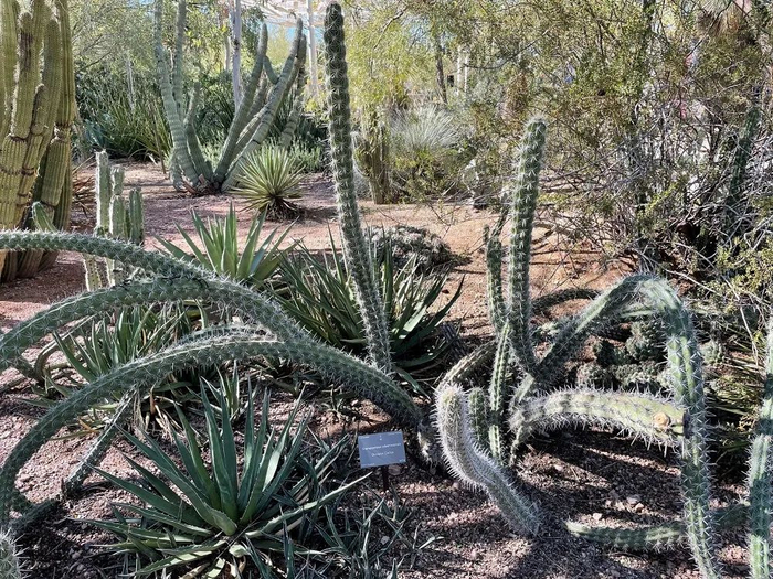 飞机甫一落地,专属于西南沙漠的那种炽烈以及干燥就扑面而来。草和树不见了踪影,换成了低矮的灌木、多肉植物,以及裸露的土和石;驱车在路上,道旁绿色树干、枝叶稀少的假紫荆(Palo verde,西班牙语直译为“绿棍子”)十分惹眼,偶尔也会出现一两个高大的仙人掌——巨人柱(Saguaro)。而这些,都在沙漠植物园里得到了更加彻底、丰富的展示。