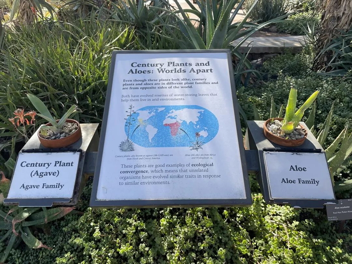 有趣的一点是,非洲大陆原生的芦荟(Aloe),和美洲大陆原生的龙舌兰(Agave),两者其实亲缘关系很远,但外貌可谓是大同小异。植物园也以这两者为例,清楚地介绍了“趋同进化”这个概念,实在是优秀。