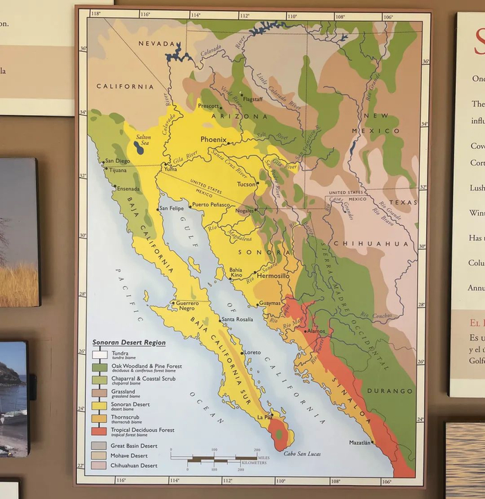 我们从展板上了解到,其实,索诺兰沙漠是四种沙漠中,降雨最“丰富”的沙漠(每年能有大概200-400mm),每年从加利福尼亚湾(就是墨西哥西部那细细的一湾水)北上的水汽,能给这个沙漠带来较为湿润的夏末和初冬。而那些巨人柱仙人掌们,就能趁此机会吸饱水分。降雨充足的年份,沙漠的早春、夏末,也会有不少野花盛开。
