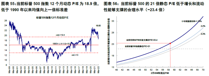 当前标普500指数21倍静态P/E低于增长和流动性能够支撑的合理水平(~23.4倍)。