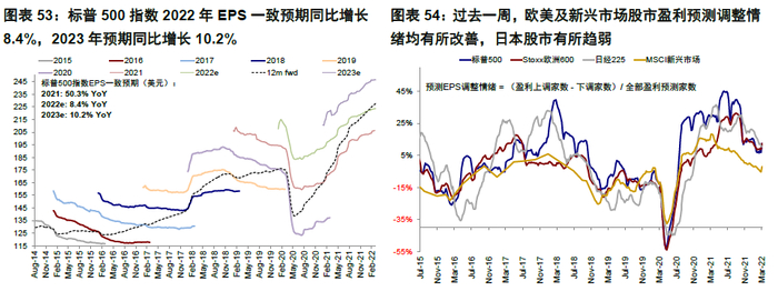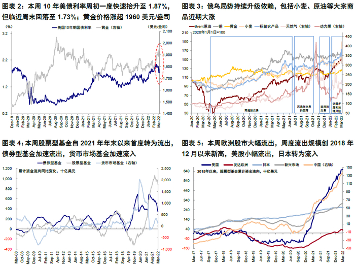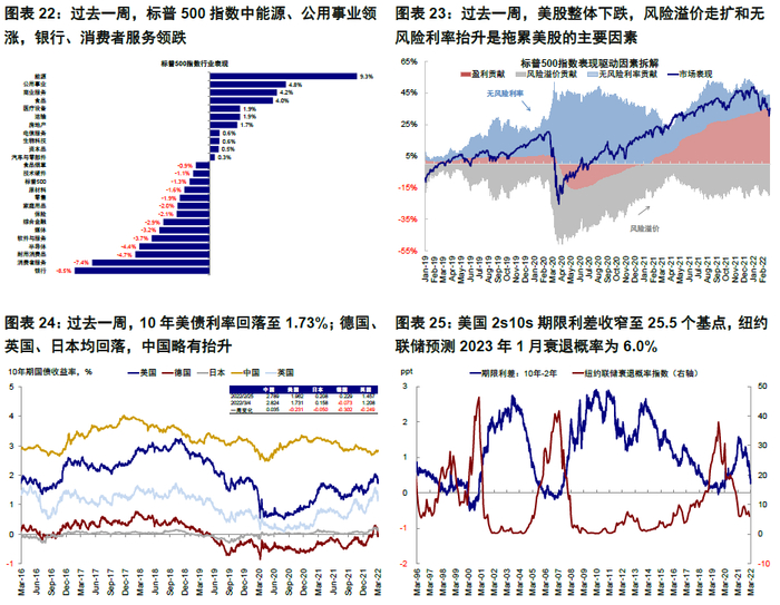 过去一周,俄乌局势继续主导全球市场表现,尤其是大宗商品快速上冲,例如原油价格上冲至接近120美元/桶,黄金价格攀升至1967美元/盎司,小麦同样大涨。货币政策方面,美联储主席鲍威尔在国会听证会给出了相对明确的加息路径,即3月加息25bp后每次会议维持加息25bp,除非通胀超预期,而缩表将会随后开启但非直接减持实施。由于这一路径并非超过市场预期甚至还有些偏弱,CME利率期货统计3月FOMC会议加息概率达98.8%,50bp加息预期基本消退。整体来看,过去一周,美元计价下,大宗>债>股;小麦、原油领涨,俄罗斯股市、俄罗斯卢布及欧洲股市领跌。板块方面,标普500指数中能源、公用事业领涨,银行、消费者服务领跌。利率方面,10年美债回落23bp至1.73%,其中实际利率大跌37bp,通胀预期抬升14bp。信用利差方面,美国投资级信用利差及高收益债信用利差均走扩。