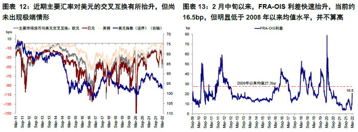 第三个渠道是金融体系,但目前主要集中在俄罗斯境内的金融资产,尚未观察到蔓延到全球流动性的情形。面对金融制裁,俄罗斯境内资产已经出现明显的“股债汇三杀”局面和部分银行挤兑现象。作为应对,俄罗斯央行加息到20%,并停止对国外投资者国债付息等以避免资金流出压力。但是由于当前制裁已经限制了一部分存留在海外的外汇储备的使用、并禁止了一些银行的美元融资和交易,因此给俄罗斯主权债务和部分银行债务偿付都造成一定压力。这一渠道下风险的可能传导路径为:若债务主动或被动违约,一些机构敞口如果暴露过大导致亏损,进而再传染到更多金融机构,就可能造成系统性的流动性风险,1998年俄罗斯债务违约进而导致LTCM破产即是如此。目前来看,不论俄罗斯对外负债敞口还是全球美元流动性状况看这一风险相对可控,但是否存在衍生品的隐性敞口以及接下来制裁的严厉程度仍值得密切跟踪。
