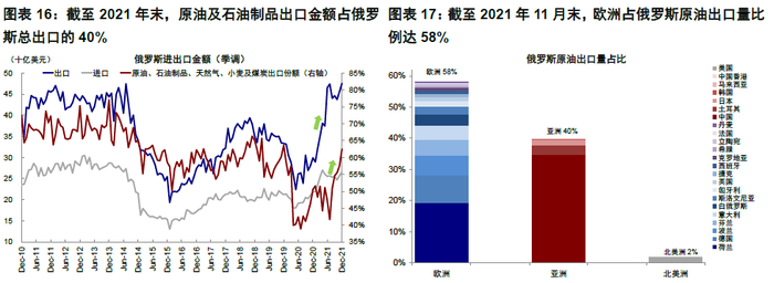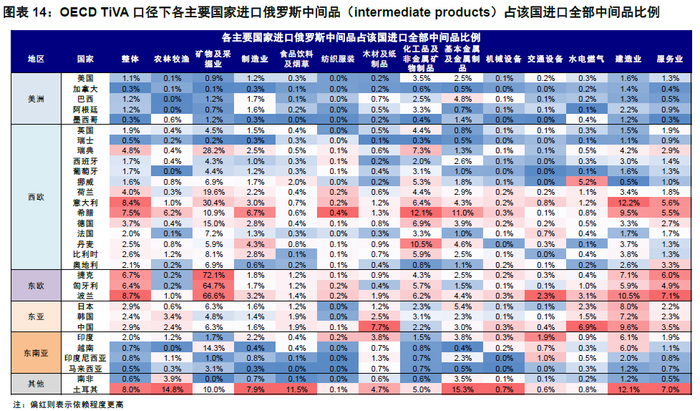 2)分市场看,东欧及部分西欧国家的依赖度更高。分地区和国家看,包括美国、加拿大及部分南美国家的美洲市场对俄罗斯中间品进口的依赖度都相对较低。相比之下,欧洲要明显更高,东欧国家如捷克(矿物及采掘业占比72.1%;化工品及非金属矿物制品占比4.3%)、匈牙利(64.7%;5.7%)、波兰(66.6%;6.2%),还有土耳其(14.8%;5.0%)对俄罗斯的能源及金属矿物进口都有较高的依赖度;意大利、瑞典、荷兰及德国等虽然要低一些,但也明显高于其他地区,因此受到此次事件影响的波及也更大。中国对俄罗斯的进口依赖主要集中于木材及纸制品(7.7%)、水电燃气(6.9%)及建造业(9.6%)。东南亚国家敞口普遍都比较低。