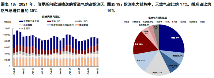 3)部分商品的供应冲击还可能导致其他替代品紧缺,如欧洲天然气供给风险可能导致对传统燃料和其他新能源的需求加大。2021年,俄罗斯向欧洲输送的管道气约占欧洲天然气总进口量的35%。近期德国宣布暂停北溪二号之后,考虑到缺气可能进一步加重欧洲能源短缺,传统燃料如煤炭及核能等其他能源替代不排除提上日程(欧洲发电结构中,核能占比27%、煤炭占比16%)。德国经济部长近期公开发言表示“从短期来看,为做好最坏打算,德国必须让燃煤电厂处于待命状态,不排除后期投入使用”;与此同时,德国经济部长表示加快德国太阳能及陆上和海上风电项目以及核能的再度建设也是可能计划。