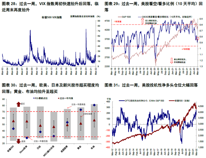 过去一周,VIX指数周初快速抬升后回落,临近周末再度抬升,美股看空/看多比例(10天平均)回落。欧美、日本及新兴股市超买程度均回落;黄金、布油均抬升至超买。仓位方面,美股投机性净多头仓位大幅回落,美元投机性净多头仓位减少,黄金投机性净多头仓位增加,10年美债净空头仓位增加,但2年期美债净空头仓位减少。