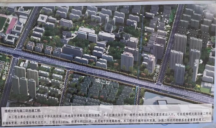 维明大街在南二环为断头路,车辆不能在二环路南北通行,需到中华大街、红旗大街或石铜路桥下调头绕行。改造后将把红旗大街至维明大街地面主路改造为高架快速路,工程完成后可实现二环路中华大街至石铜路的全程高架。