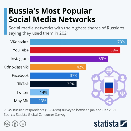 根据Statista在2021年的调研,俄罗斯最流行的前6个社交媒体平台分别是VK、YouTube、Instagram、Odnoklassniki、Facebook、TikTok。