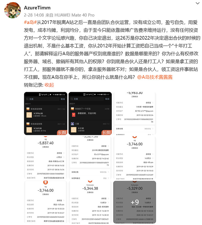 争论很快进行到双方对线环节,A岛和岛主ATM公示了近几年向三酱支付服务器费用的转账记录,并对三酱的工资要求提出了质疑:如果三酱把自己看作需要发放工资的“员工”,那么并没有修改域名、撤销权限、甚至带走服务器的权力;而若是作为“合伙人”身份,其他合伙人也并没有向三酱支付额外工资的义务。