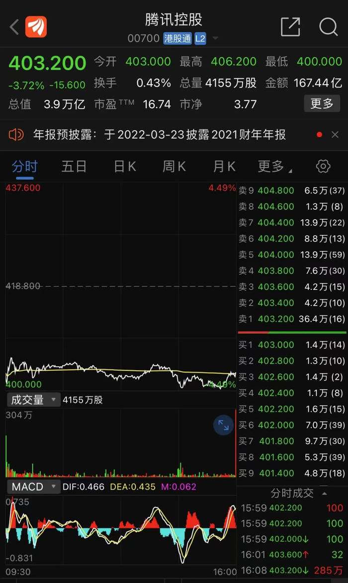当日腾讯控股盘中一度跌超4%,股价跌至400港元关口,创2020年5月以来新低,总市值再次跌破4万亿港元关口,最终收盘总市值为3.9万亿港元。
