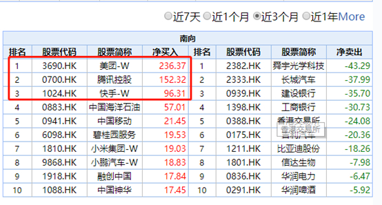 拉长时间来看,南向资金抄底互联网股票更为明显。据Wind统计,近3个月来,美团获南向资金净买入236.37亿元,腾讯控股获净买入152.32亿元,快手获净买入96.31亿元。