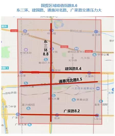 史家、德胜、中关村等主要学区,金融街、国贸CBD、望京等主要商务、通勤区,以及国家体育场、核心区等重点区域路网早高峰交通压力突出,部分道路局部路段持续拥堵。