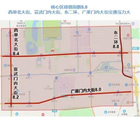 东城、西城核心城区,东部、北部、西部区域环路,以及主要高速、联络线进城方向交通压力突出,短时交通指数达8.8左右;中小学校周边路网上下学时段交通压力突出;国家体育场、核心区周边相关道路将根据赛事和重要活动需要采取临时交通管制措施。