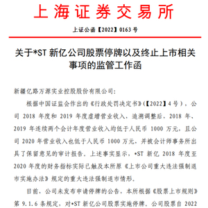《监管工作函》显示,上交所已发出拟终止*ST新亿股票上市的事先告知书,后续将在规定时间内根据上市委员会的审核意见,作出公司股票终止上市决定。