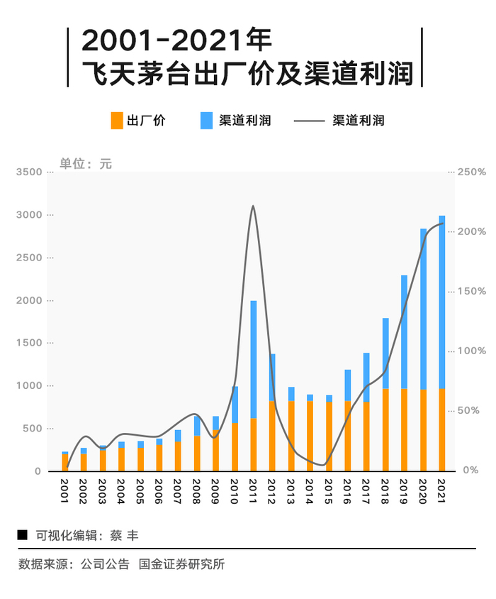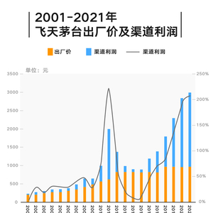 2011年,53度飞天茅台的出厂价只有619元,但当时飞天茅台的市场价格已经上涨至2000元/瓶,2012年9月,茅台将出厂价一口气提高了33%到819元/瓶,市场价格也迅速突破了2300元/瓶的高点。