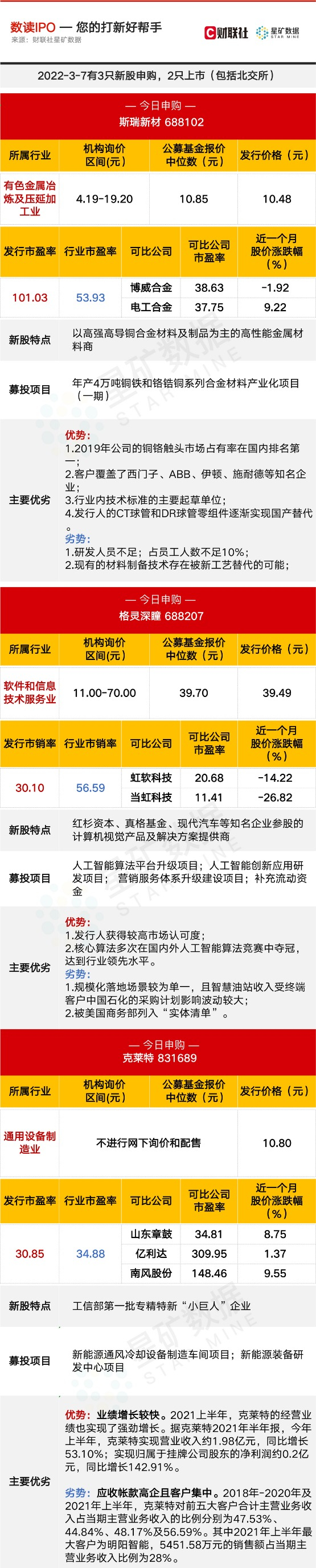 今日共计3只新股申购,分别为:科创板的斯瑞新材、格灵深瞳,北交所的克莱特;另有2只新股上市,分别为:创业板的华是科技、科创板的华秦科技。