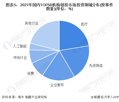 从我国TOP机构在创投市场投资领域分布来看,2021年我国TOP50机构主要投资分布在医疗、现进制造和企业服务领域,三大领域投资事件数量合计占比近60%。