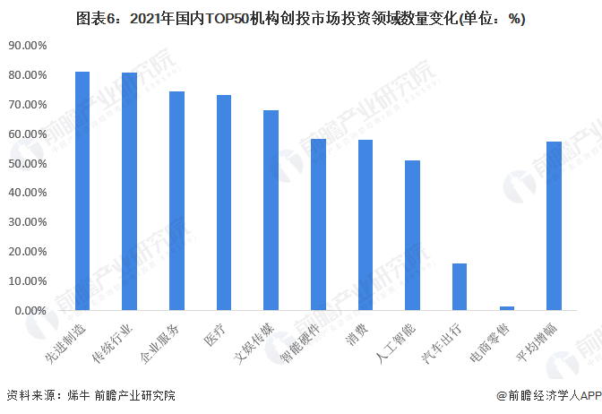 具体看各领域的投资数量变化来看,2021年TOP50投资机构在各领域投资数量都有明显的增长。其中,在先进制造领域和传统行业领域,机构投资数量增幅最大,均超过80%,由此可见,实体制造业受头部机构关注度持续提升。