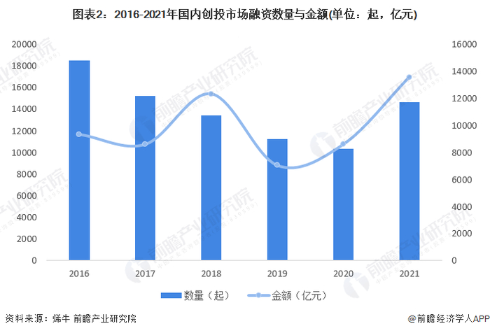 从我国创投市场融资金额和数量近几年变化情况来看,自2016年起,我国创投市场融资事件发生数量呈现连续多年的下降趋势,而融资金额整体呈现波动变化的态势。2021年国内创投市场随着疫情逐步得到控制有所回暖,国内创投市场金额和规模分别达到13550亿元和14629起,分别同比增长了57.56%和41.26%。
