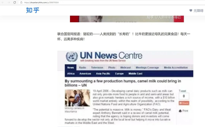 以上图文章为例,它原意为推广骆驼奶制品,以缓解干旱、贫瘠地区的人们食物紧张问题和增加收入。然后它被人为刻意曲解,“变”成联合国对骆驼奶医疗和养生价值的“肯定”。