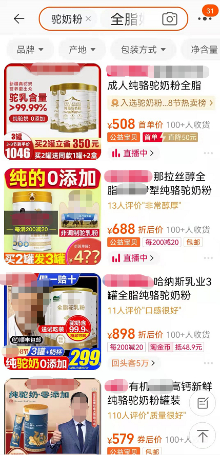 电商平台上,这些名称中含“驼乳”或“驼奶”字样的产品,价格跨度非常大,下至十几元,上至七八百元……