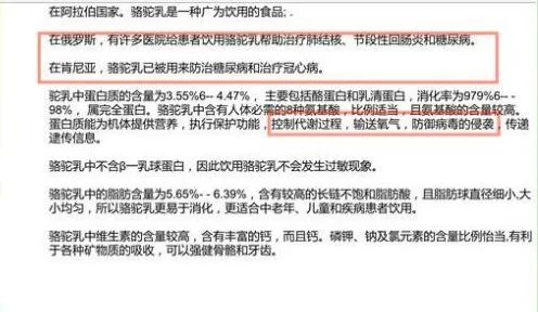 驼奶粉的主要客群是中老年人,“不神不好卖货”。为了利益,许多驼奶企业和销售人员会刻意夸大驼奶的保健效果,宣传产品可治疗疾病等现象在驼奶行业十分普遍——长期喝驼奶,“抗衰老”“增强免疫力”“抵抗病毒”“女性永葆青春容颜,男性精力充沛,老人长寿健康”“病人身体出现巨大变化”,甚至驼奶还可以“治疗肺结核”“对癌症有效”等等。