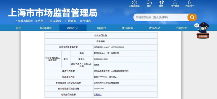 中国网财经3月7日讯 (记者 李静)上海市市场监督管理局日前发布的信息显示,曼可顿食品(上海)有限公司销售的多款食品因“对商品或者服务作引人误解的虚假宣传”,被上海市闵行区市场监督管理局罚款6万元。